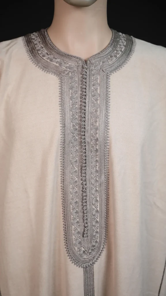 صناعة تقليدية متقنة: مزين بـ خدمة المعلم والـ سفيفة المنسوجة بعناية على طول الصدر والرقبة، مما يضفي عليه هيبة تقليدية لا مثيل لها.